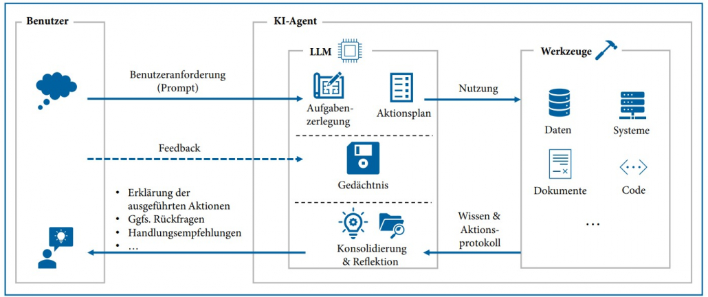 Agenten sind digitale Systeme, die mithilfe von großen Sprachmodellen, sogenannten Large Language Models (=LLMs) wie GPT von OpenAI, Claude Sonnet oder Gemini von Google, Aufgaben eigenständig bearbeiten können. Dabei planen und agieren sie iterativ, nutzen Werkzeugintegration und speichern Feedback in einem internen Gedächtnis (siehe Abbildung 1).