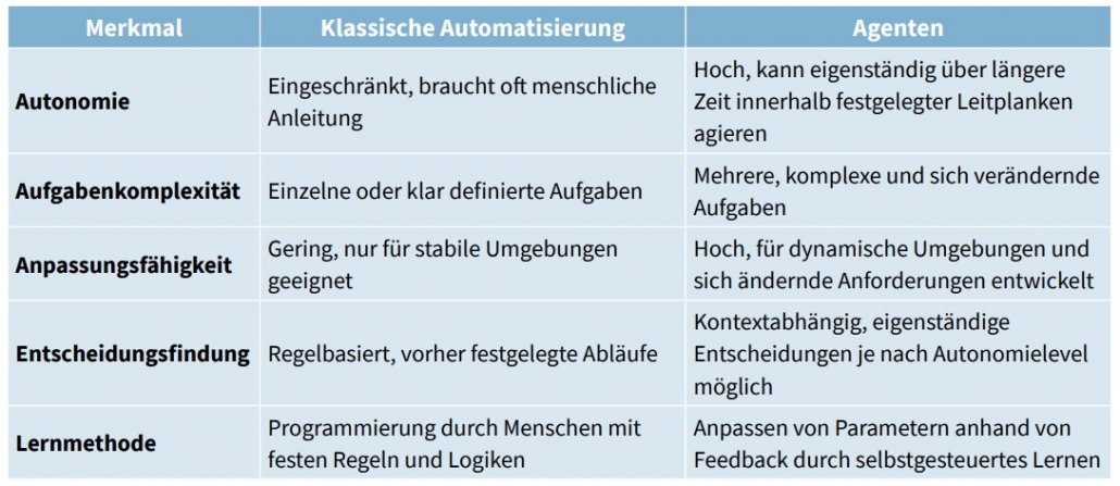 und adaptieren Logiken. Tabelle 1 fasst die Unterschiede zwischen Agenten und klassischer Automatisierung zusammen.