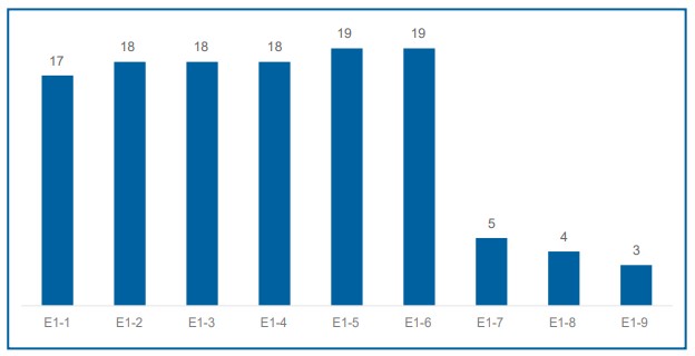 Abbildung 3 gibt einen Überblick über die Anzahl der Finanzunternehmen im Sample, welche Angaben zu einzelnen Angabepflichten gemäß ESRS E1 machen. Alle Unternehmen im Sample berichteten über ihren Energieverbrauch und Energiemix (E1-5) sowie über ihre Treibhausgasemissionen (E1-6). Darüber hinaus legen 18 von 19 Finanzunternehmen ihre Strategie zum Klimaschutz und zur Anpassung an den Klimawandel (E1-2), die zugehörigen Maßnahmen und Mittel (E1-3) sowie ihre Ziele zum Klimaschutz und Anpassung an den Klimawandel (E1-4) offen. Einen Übergangsplan für den Klimaschutz (E1-1) veröffentlichen 17 Unternehmen. Drei Angabepflichten wurden hingegen nur von einem kleinen Teil der Unternehmen als wesentliche Berichtsinhalte identiziert: So berichten lediglich fünf Finanzunternehmen über den Abbau von Treibhausgasen und Projekte zur Verringerung von Treibhausgasen, finanziert über CO2-Gutschriften (E1-7). Vier Unternehmen legen Informationen zu ihrer internen CO2-Bepreisung (E1-8) offen, und nur drei Unternehmen machen Angaben zu den erwarteten finanziellen Auswirkungen wesentlicher physischer Risiken und Übergangsrisiken sowie potenziellen klimabezogenen Chancen (E1-9). Letzteres ist vermutlich auf eine Übergangsbestimmung zurückzuführen, welche dazu führt, dass diese Angabe im ersten Jahr der Erstellung der Nachhaltigkeitserklärung entfallen kann bzw in den ersten drei Jahren lediglich in qualitativen Angaben vorgenommen werden kann.