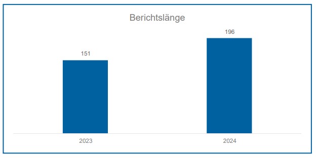 Abbildung 2 gibt hierzu einen Überblick. Im Durchschnitt stieg der Umfang der Berichte um 29,8 % von 151 auf 196 Seiten. Bei fünf Unternehmen wurde eine Reduktion der Berichtslänge durch die ESRS-Berichterstattung beobachtet. Im Vergleich zum Vorjahr wurden hier insbesondere (potenziell) nicht wesentliche Inhalte, grafische Elemente und Interviewformate weggelassen. Die daraus resultierenden ESRS-Berichte zeichnen sich durch eine höhere Informationsdichte und eine stärkere inhaltliche Fokussierung aus. Bei einem Unternehmen ist die Berichtslänge zum
