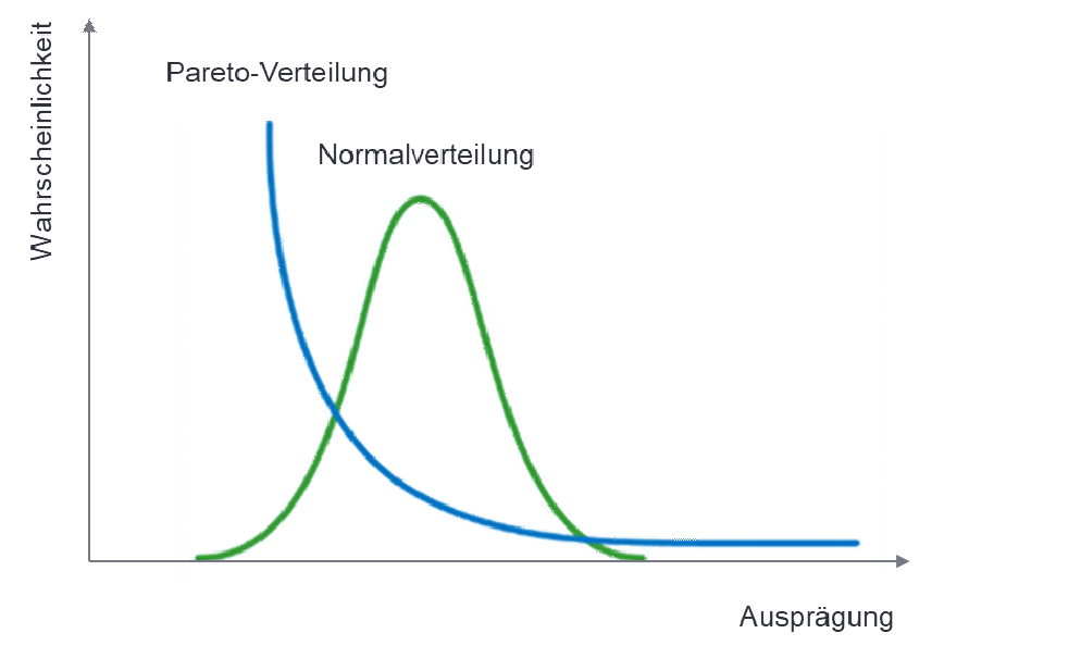Die Krisen zeigen uns sehr deutlich, dass wir uns von der Ansicht, die meisten Dinge (und damit auch die meisten Risiken) seien normalverteilt, verabschieden müssen (vgl. Gore, A., 2022). Normalverteilungen zeichnen sich durch ihre Symmetrie aus. Positive und negative Abweichungen vom Erwartungswert sind gleich wahrscheinlich. In der Praxis sind aber nicht-symmetrische Verteilungen, insb. Pareto-Verteilungen, wesentlich häufiger: Pareto-Verteilungen (benannt nach dem Ökonomen Pareto, der Anfang des 20. Jahrhunderts feststellte, dass 20% der Menschen in Italien 80% des Landes besaßen) ähneln einem Hockeyschläger mit einem langen „Tail“, wie in der Abbildung unten dargestellt.