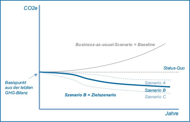 Die CO2e-Bilanz, die in der Regel nach dem GHG-Protokoll (Greenhouse Gas Protocol) erstellt wird, ist nicht nur ein verpflichtender Bestandteil des ESRS E1-1, sondern auch ein wesentlicher Ausgangspunkt für die Ableitung der Dekarbonisierungsziele. Ähnlich wie Daten aus der Finanzbuchhaltung in der Finanzsteuerung bilden Daten aus dem Carbon Accounting hierbei die Basis. Gemeinsam mit den Daten des Business-Plans, der die finanzielle Geschäftsentwicklung abbildet, wird ein Business-as-usual-Szenario entwickelt. Diese Baseline zeigt, wie sich die CO2e-Emissionen entwickeln würden, wenn keine zusätzlichen Dekarbonisierungsmaßnahmen ergriffen werden. In diesem Zusammenhang werden sowohl interne Aspekte, wie das organische und anorganische Wachstum des Unternehmens und die Entwicklung von Geschäftsbereichen mit geringen oder hohen Emissionen, berücksichtigt als auch externe Aspekte, wie die Dekarbonisierung des Strommixes, in Betracht gezogen.