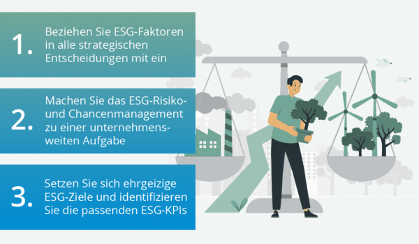 Wie bereits erwähnt, ist einer der wichtigsten Maßnahmen des CFO die Integration von ESG in die Unternehmensstrategie. Drei Schritte sind dabei wesentlich: