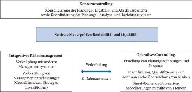 Nachdem unternehmerische Aktivitäten stets mit Risiken verbunden sind, benötigen Konzerne auch Risikomanagementsysteme. Integrative Risikomanagementsysteme sind zum einen mit anderen Managementsystemen verknüpft bzw tauschen mit diesen Daten aus. Zum anderen ist das Risikomanagement idealerweise in die Vorbereitung von konkreten Managemententscheidungen integriert, etwa das Geschäftsmodell, die Strategie oder Investitionen betreffend.[22] Ein entscheidungsorientiertes Risikomanagement greift in diesem Zusammenhang auf Informationen und Daten aus dem Controlling zurück. Nachdem Risiken aus Controlling-Sicht mögliche Planabweichungen darstellen, muss deren Identifikation, Quantifizierung und kontinuierliche Überwachung im Controlling-System verankert werden.[23]