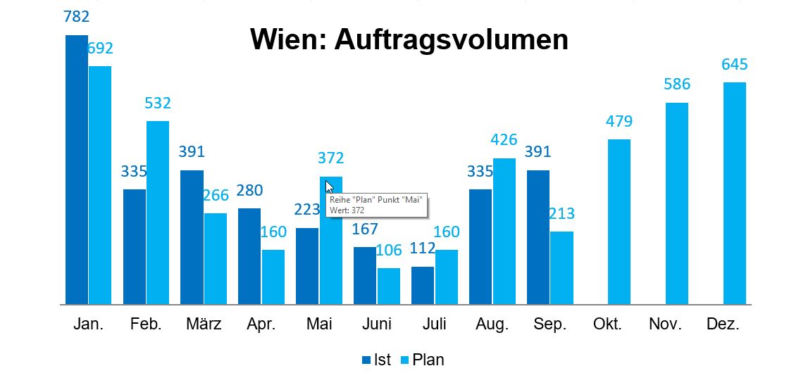 Nimmt man den 3D-Effekt weg und beschriftet die Säulen direkt (anstelle der y-Achse), wird rasch ersichtlich, in welchen Monaten der Plan über- bzw. unterschritten wurde. Als Alternative könnte der Plan/Ist-Vergleich auch sehr gut mit einem sog. Inbar-Diagramm visualisiert werden.