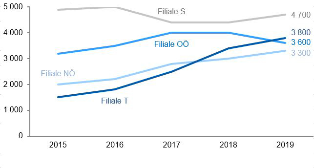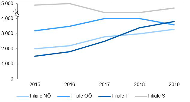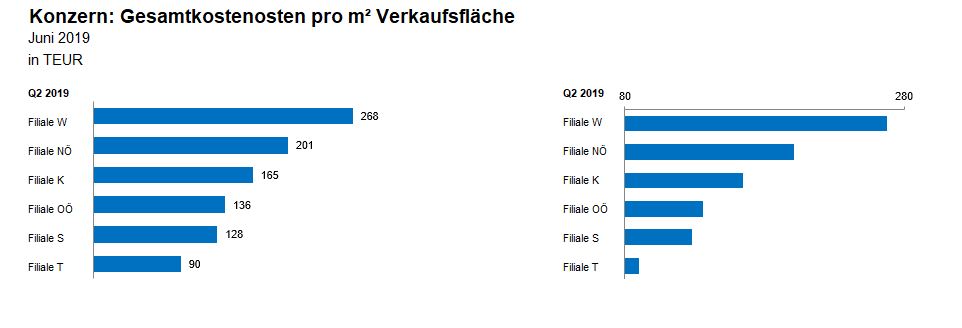Balkendiagramme sind perfekt geeignet, um Strukturvergleiche anzustellen. Im konkreten Beispiel werden die Filialen eines Unternehmens miteinander verglichen. Die Zahlenwerte sollten dabei aber direkt neben den Balken angedruckt und die Achsen keinesfalls abgeschnitten werden.