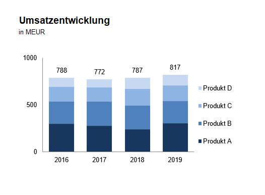 Sowohl das gestapelte Säulendiagramm als auch die Aufgliederung in mehrere Diagramme (Small Multiples) haben ihre Berechtigung im Reporting. Ersteres zeigt schön die Entwicklung des gesamten Umsatzvolumens und erlaubt eine näherungsweise Einschätzung der Entwicklung der Segmente (Produktgruppen). Die Darstellung mit vier kleinen Diagrammen hat den Vorteil, dass die Entwicklung der Produktgruppen noch besser ersichtlich wird.