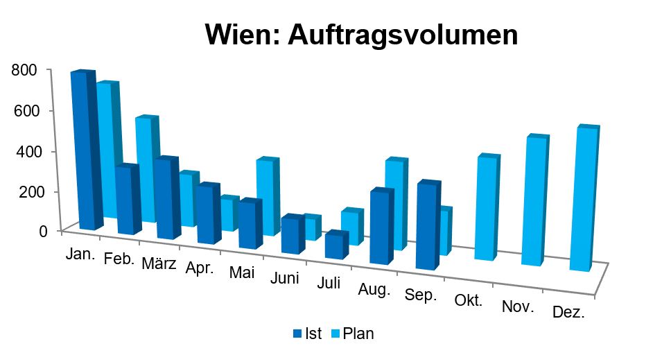 Nimmt man den 3D-Effekt weg und beschriftet die Säulen direkt (anstelle der y-Achse), wird rasch ersichtlich, in welchen Monaten der Plan über- bzw. unterschritten wurde. Als Alternative könnte der Plan/Ist-Vergleich auch sehr gut mit einem sog. Inbar-Diagramm visualisiert werden.