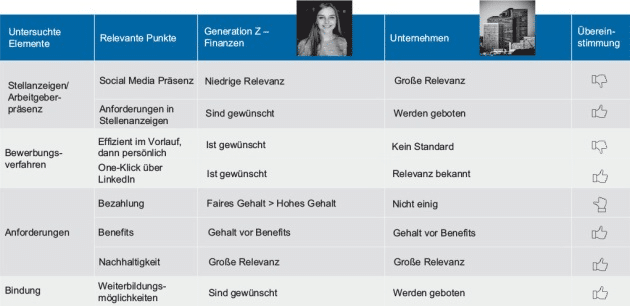 Unternehmenswerte, faire Bezahlung oder Weiterbildungsmöglichkeiten sind zentrale Schlagworte in diesem Zusammenhang. In der Gegenüberstellung der genannten Erwartungen der Generation Z und dem, was Unternehmen aus dem Finanzsektor heute bieten bzw als Erwartungshaltung der angehenden Mitarbeiter an sie wahrnehmen, zeigt sich, dass eine hohe Übereinstimmung vorliegt. An einigen Stellen können die Unternehmen den Anforderungen der Generation Z gegenwärtig jedoch noch nicht ganz genügen – die Effizienz im Bewerbungsprozess hinkt den Ansprüchen einer technikaffinen Generation oftmals noch hinterher. Andererseits wird die Bedeutung der Präsenz von Social Media offenbar in den Unternehmen anders bzw wichtiger eingeschätzt als von den potenziellen Bewerbern selbst.