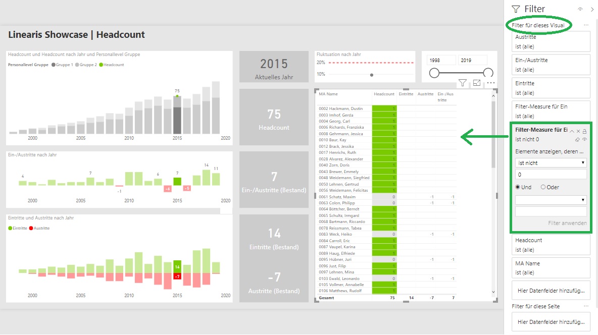 Sie sind hier: Startseite1 / Interaktives HR Dashboard in Power BI – Teil 22 / 04-3-Showcase-Headcount-Table-Visual-gefiltert-mit-Measure-Filter