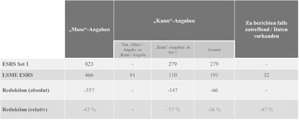 Basierend auf den Basis for Conclusions seitens der EFRAG[24] wird in Abb 3 die Vereinfachung der Angabepflichten iSd ESRS Set 1 und des Entwurfs zu den ESRS LSME dargestellt. Somit konnte mittels der Kombination aus Reduzierung von „Muss“-Angaben und der Wandlung von „Muss“– in „Kann“-Angaben eine Reduktion von knapp weniger als der Hälfte der Gesamtanzahl von Datenpunkten erzielt werden.