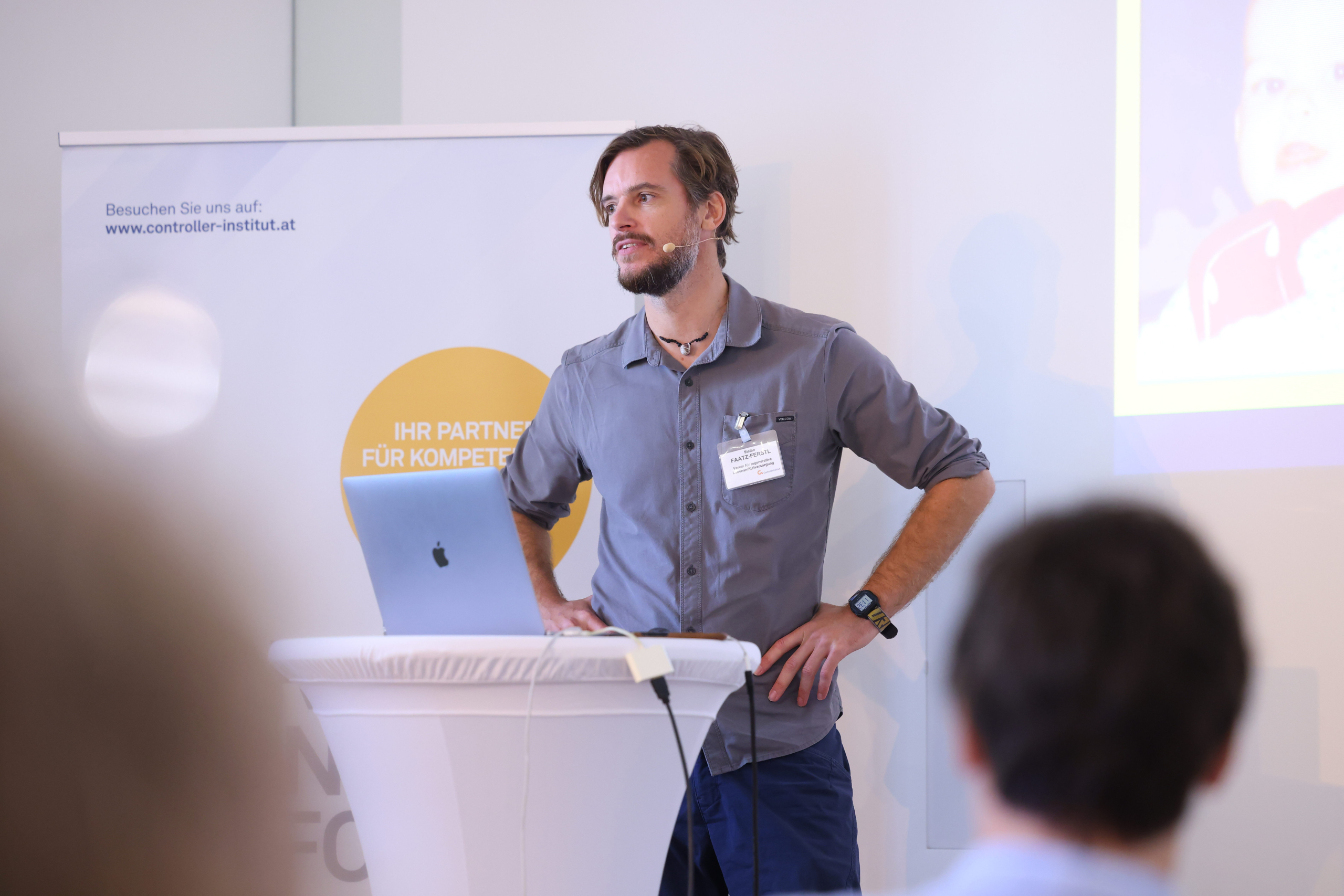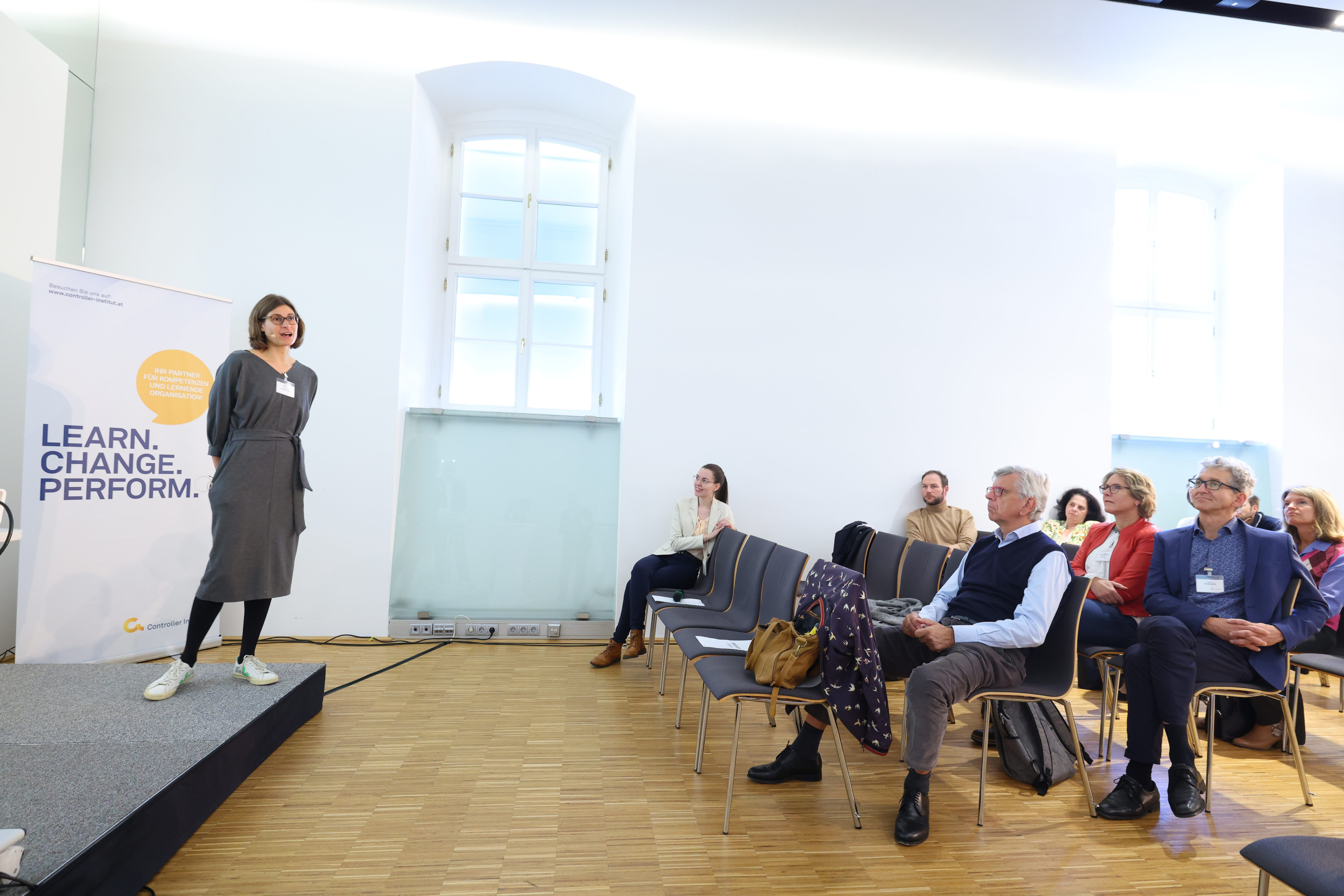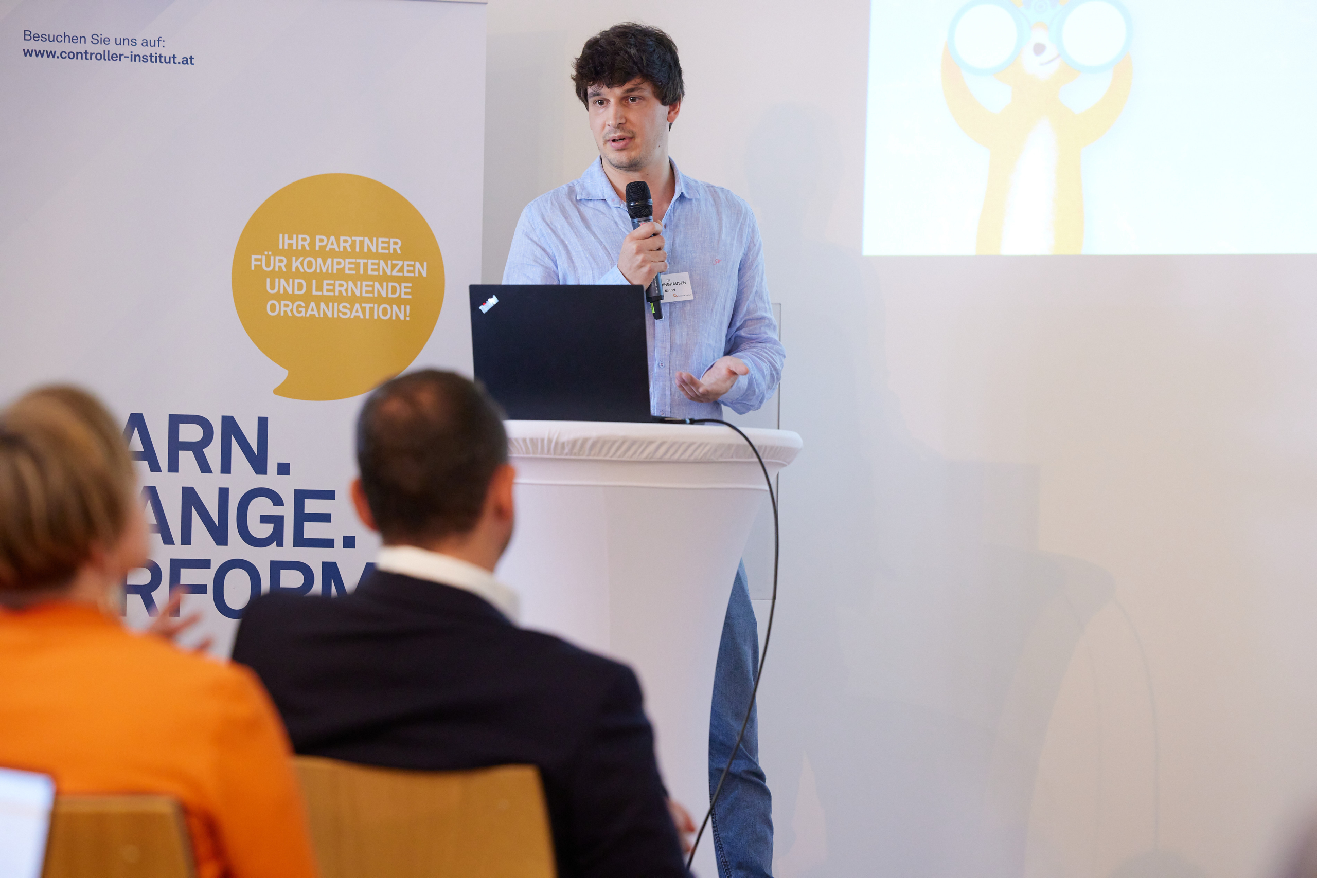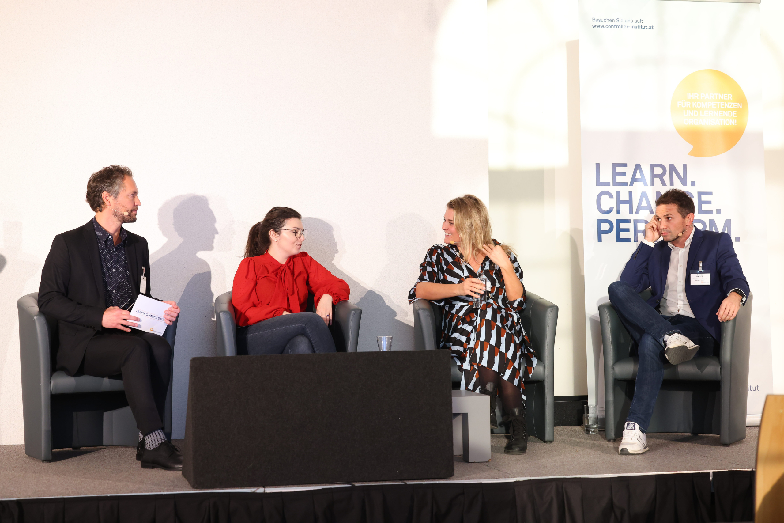 Nach der ersten Kaffeepause fanden zwei parallele Round Tables statt. Im Round Table A diskutierte Clemens Nachbauer (Controller Institut) zum Thema Next Generation Leadership: Wert & Wirkung von nachhaltiger Führung. Dazu bat er Natalya Nepomnyashcha (Netzwerk Chancen), Christoph Mayer (Weinviertel Museum Betriebs GmbH) und Hannah Lux (Vollpension) auf die Bühne.