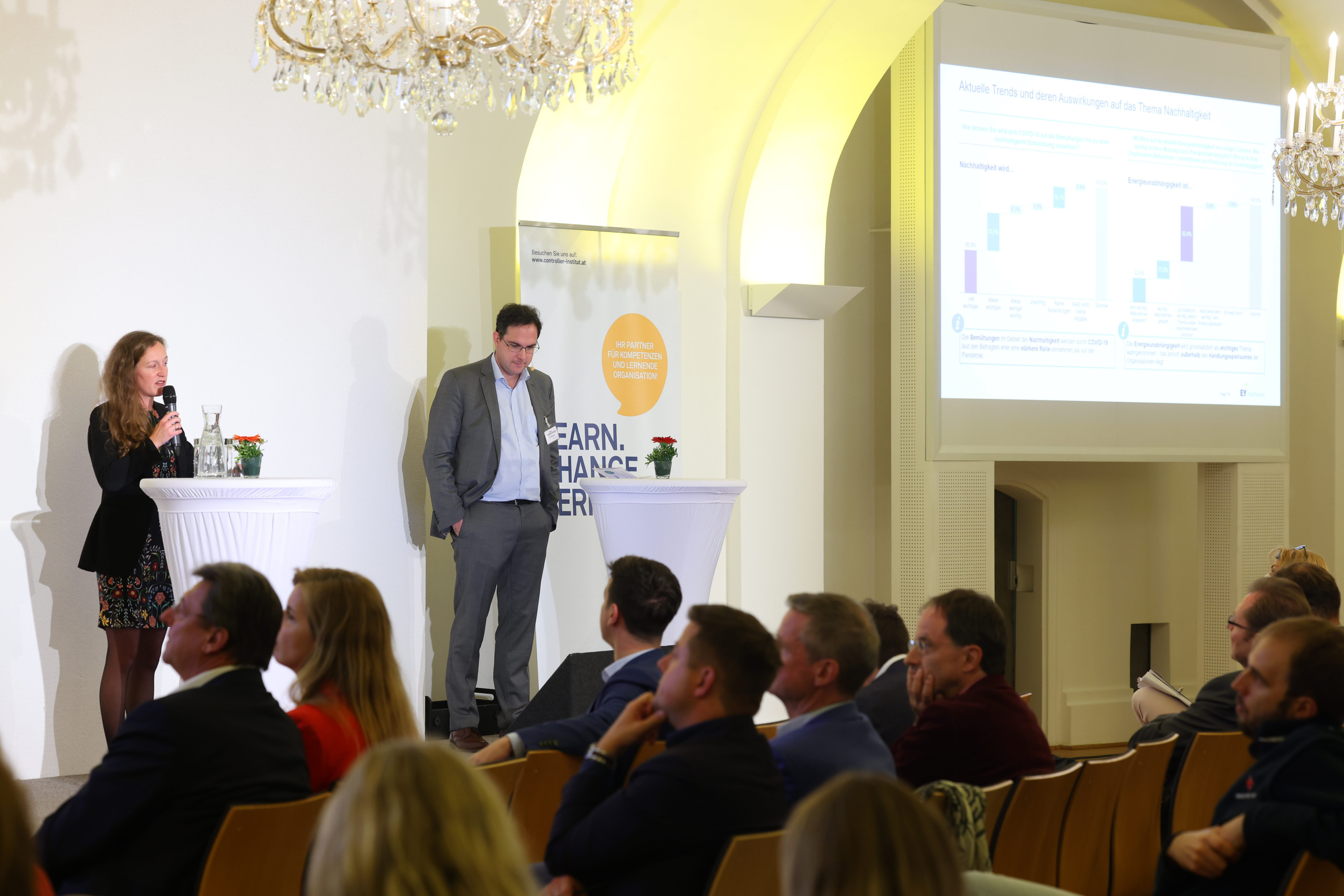 Der letzte Programmpunkt des ersten Tages bestand aus der Präsentation einer Studie zum Thema Nachhaltigkeit bei NPOs und im öffentlichen Sektor. Martin Bodenstorfer und Christina Gobin-Reider (EY Parthenon) präsentierten erstmals ihre Studie. Für den Großteil der Organisationen im öffentlichen Bereich spielt Nachhaltigkeit eine große bis sehr große Rolle (90%), 70% der Teilnehmenden geben an, Nachhaltigkeit auch bereits in der organisationalen Strategie verankert zu haben. „Nachhaltigkeit wird sowohl wirtschaftlich als auch für die öffentliche Wahrnehmung als profitables Thema gesehen“, so Bodenstorfer.