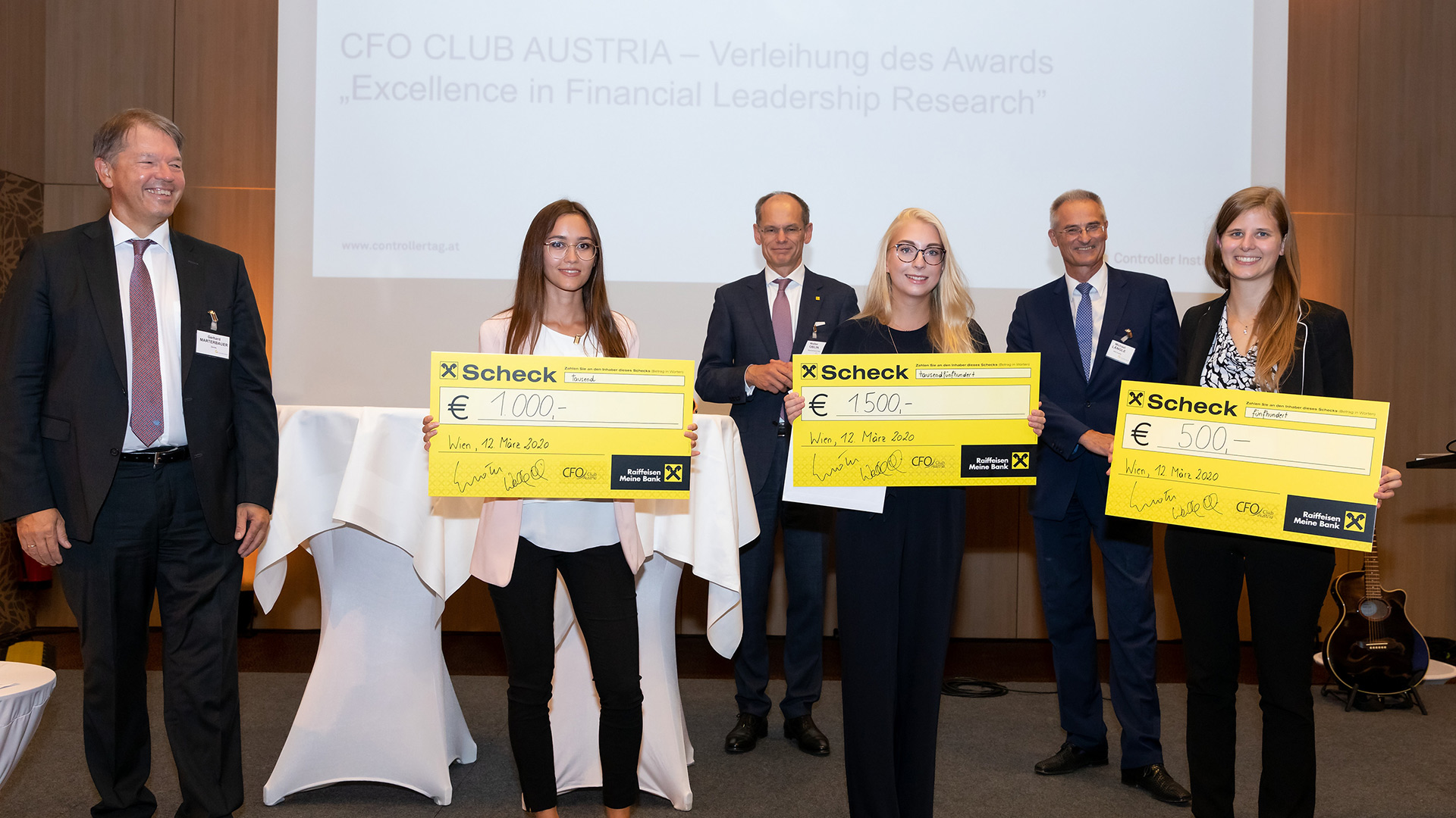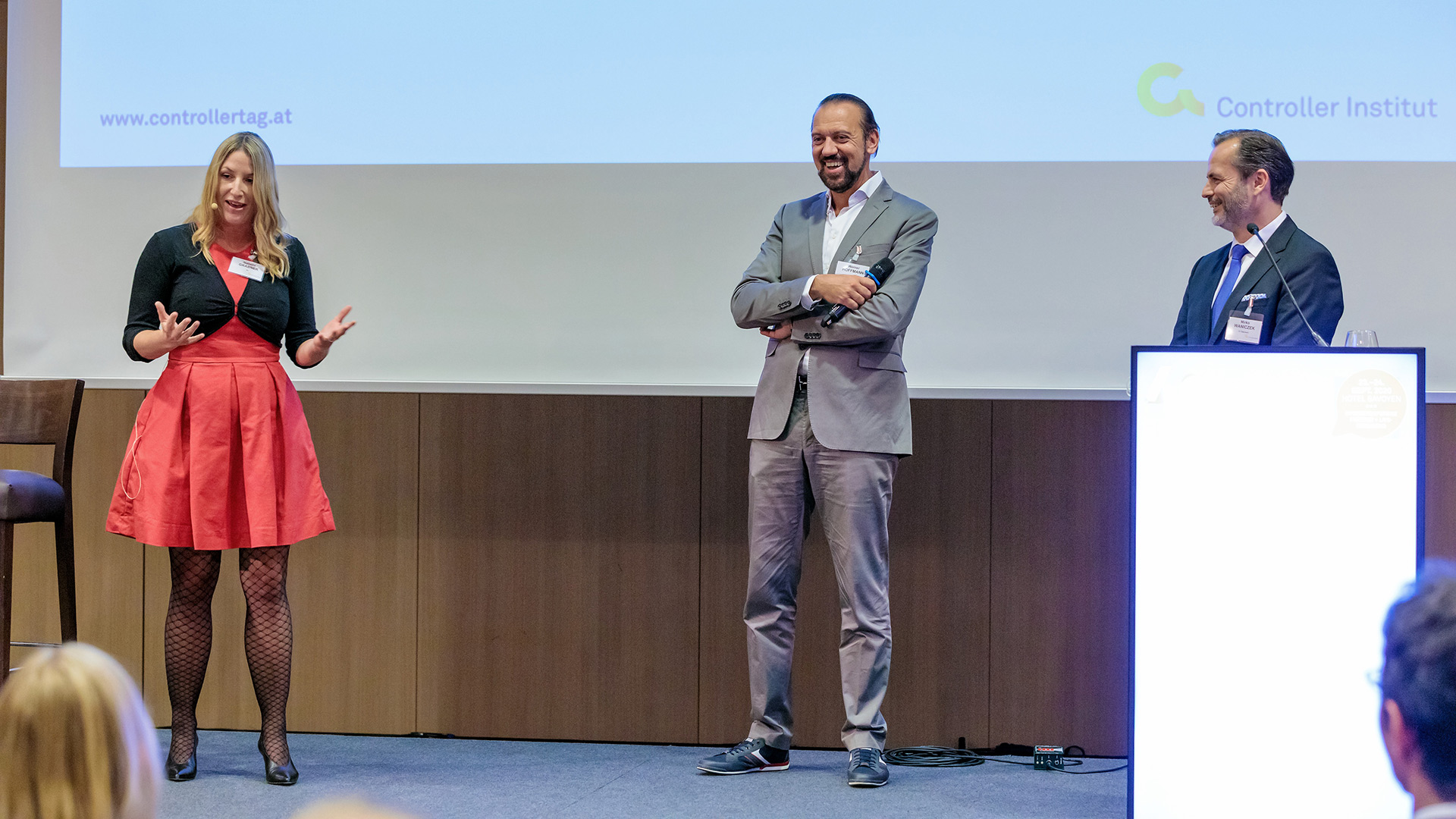 „Eigentlich wollten wir nur das Controlling erneuern, haben nun aber die letzten Monate genutzt, um auch gleich den gesamten Kongress zu digitalisieren“, schmunzelte Rita Niedermayr (Geschäftsführerin | Österreichisches Controller-Institut) bei ihrer Begrüßung zur Abendveranstaltung. Bevor Bernhard Baumgartner den Teilnehmenden mit seinem Programm „Humorcontrolling“ unter anderem unter den Schlagworten „von VUKA zu WUKI“ den Abend versüßte, wurde traditionell der Award „Excellence in Financial Leadership Research“ für die beste Masterthesis des Masterprogramms „Strategy, Innovation und Management Control“ der WU verliehen. Die Vertreter des CFO-Club Austria Walter Oblin (Österreichische Post AG), Gerhard Marterbauer (Deloitte) und Michale Längle (RAG Austria AG) stellten sich an diesem Abend wahrer Frauenpower. Die drei Gewinnerinnen Bettina Spiegel (3. Platz), Corinne Baumgartner (2. Platz) und Sophie Atzenhofer (1. Platz) waren sichtlich stolz über die Auszeichnungen.