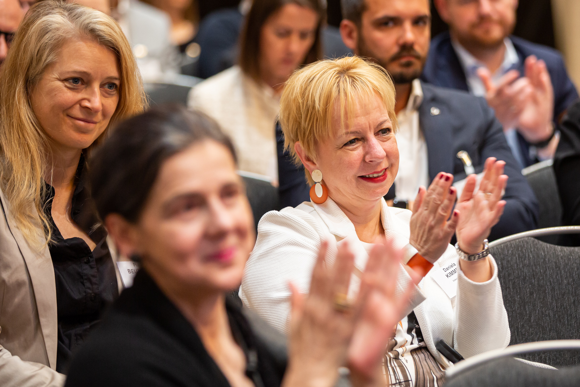 Im Anschluss an zwei sehr spannende Keynotes bat Karin Exner neben Reinhard Schwendtbauer noch Katharina Binder-Pöchacker (OMV), Katharina Zeitlhofer (Palfinger) und Fabian Ringler (ÖBB Infrastruktur) zur Podiumsdiskussion auf die Bühne.