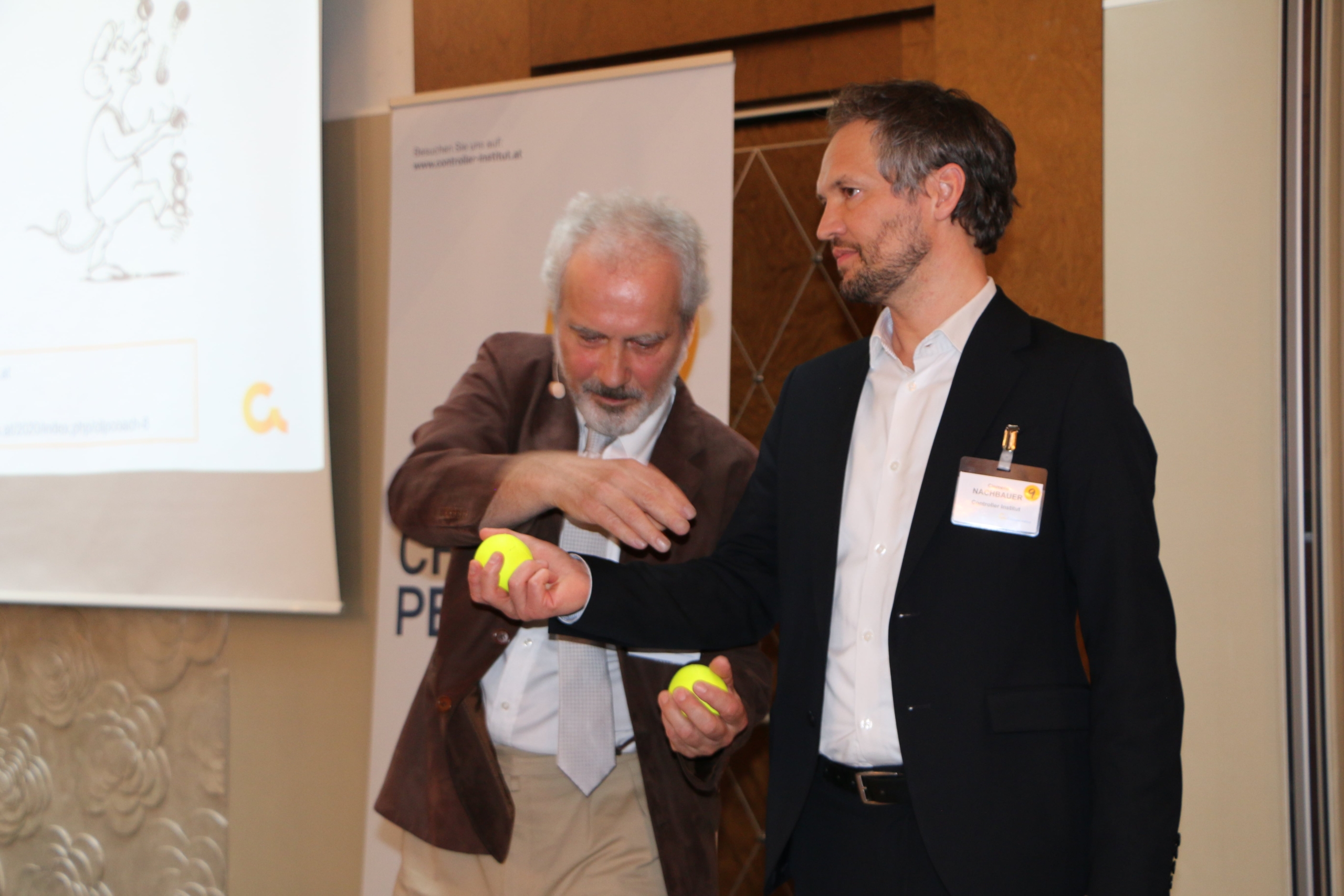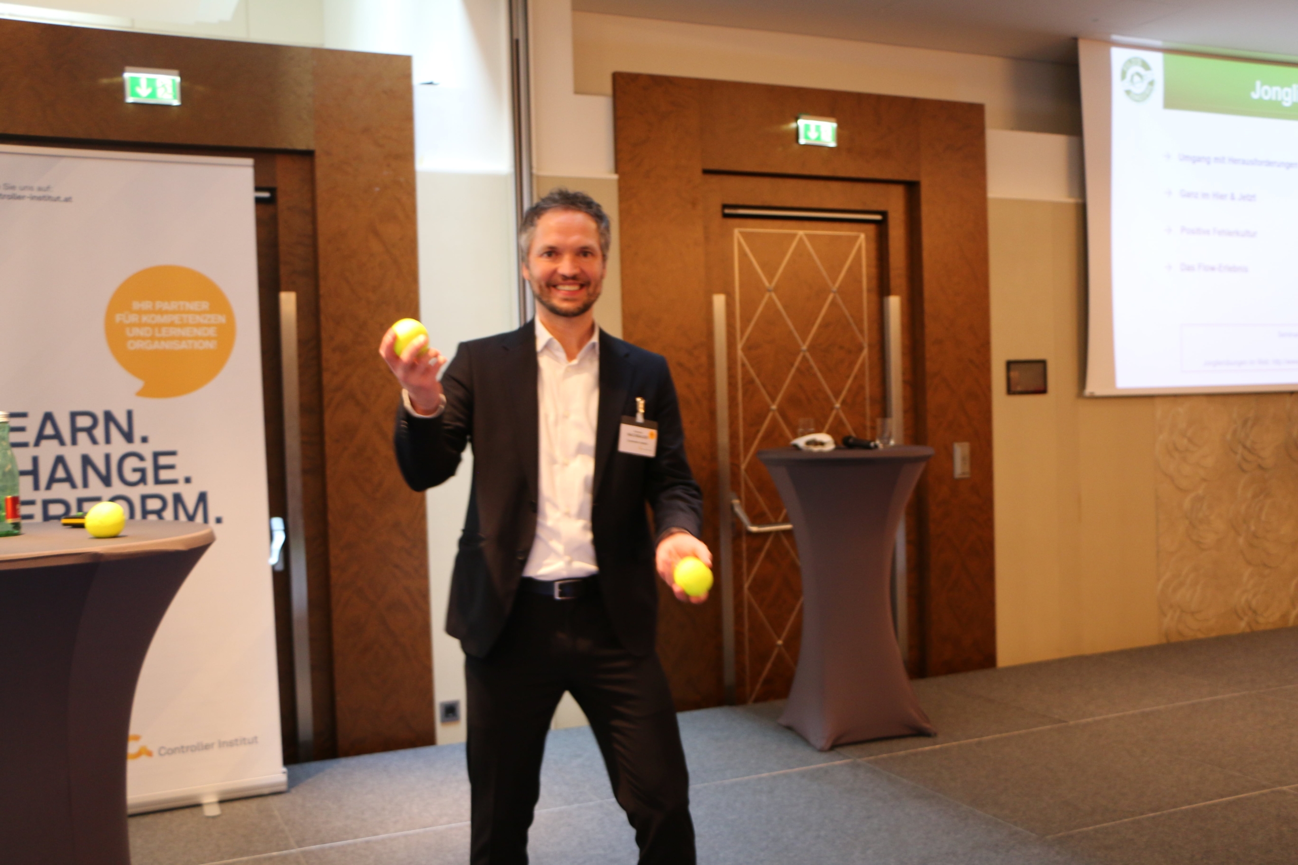 Den Abschluss des Tages bot Clemens Nachbauer (Controller Institut) mit seinem Vortrag Leadership in Motion – Wie Sie als Führungskraft in dynamische Balance kommen. Das Überraschungshighlight: Mario Filzi zeigte den Teilnehmer:innen wie schnell sie es schaffen, mehrere Bälle gleichzeitig jonglieren zu können. Im wahrsten Sinne des Wortes.