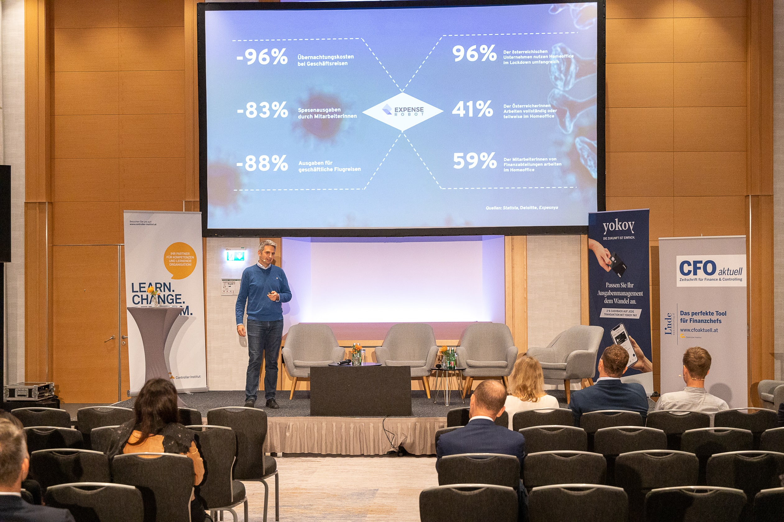 Wie plant der Finanzbereich auch in unsicheren Zeiten vorausschauend? Unter dieser zentralen Fragestellung fand das Forum 8 statt. Während das Thema Spesen zu Corona-Hochzeiten weitestgehend still stand, bewegt sich jetzt wieder etwas in diesem Bereich. Thomas Inhelder sprach über die Automatisierung des Ausgabenmanagements. Peter Grausgruber (Bitpanda), Jonathan Schmidt, Thomas Inhelder (beide Yokoy) und Caroline Pranzl (BAWAG) diskutierten mit dem Plenum in Anschluss darüber.