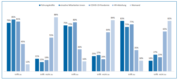 Das mag fortschrittlich erscheinen, gleichzeitig spielen agile Methoden bei 44 % noch keine Rolle und 38 % weisen darauf hin, dass die Führung nicht transparenter wurde. Wenn die Corona-Pandemie etwas gezeigt hat, dann, dass Innovation und Flexibilität in der Arbeitskultur wichtiger sind als etablierte Regeln und erzwungene Workflows. Ganz im Gegenteil, diese können der Produktivität sogar im Weg stehen. Interessant ist, dass gerade die jüngeren Befragten (<30) die einzelnen New-Work-Kriterien in ihren Unternehmen am besten einschätzen. Wohl auch deshalb, weil gerade diese Generation New Work ganz besonders repräsentiert und das Bewusstsein dafür stärker ausgeprägt ist. Von wem oder was nun die Impulse für eine Veränderung der Arbeitskultur ausgehen, wurde ebenfalls erhoben. Wer im Unternehmen macht sich für die Neugestaltung der Arbeit stark? Die Befragung zeigt wenig überraschend, dass es nicht die „eine“ treibende Kraft für New Work gibt, sondern dass Führungskräfte in 80 % und Mitarbeitende in 74 % der Fälle arbeitsteilig Anteil an der Erneuerung haben. Und mit einer Zustimmung von 78 % bestätigt sich auch die Vermutung, dass die Corona-Pandemie den Takt vorgegeben hat. Ohne Corona wären die Fortschritte in den Unternehmen in Richtung einer neuen Arbeitswelt deutlich geringer ausgefallen. Etwas abgeschlagen rangiert berraschenderweise die HR-Abteilung, der in nur 36 % der befragten Organisationen eine aktive Rolle im Zusammenhang mit der Veränderung der Arbeitswelt zugesprochen wird. Die Einschätzung, wer sich für eine neue Arbeitskultur stark macht, ist aus Sicht der einzelnen Altersgruppen unterschiedlich: Die unter 30-Jährigen sehen mit 85 % einzelne Mitarbeitende im Lead, währenddessen die über 40-Jährigen den Führungskräften den größten Einfluss zuschreiben (83 %). Dies mag mitunter auch daran liegen, dass in der Gruppe der über 40-Jährigen der Anteil an Führungskräften größer ist als bei den unter 30-Jährigen.