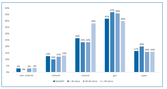Wie schätzen die Befragten nun ihre persönliche Arbeitssituation als zusammenfassende allgemeine Bezeichnung für die arbeitsbezogenen Umstände und Gegebenheiten konkret ein? Die Mehrheit der Befragten beurteilt die eigene Arbeitssituation mit 59 % positiv bzw sehr positiv. Nur 16 % der Befragten empfinden ihre Arbeitssituation als schlecht bzw sehr schlecht. 26 % sind indifferent, können bzw wollen sich nicht festlegen. Auch hier gibt es wiederum interessante Ergebnisse nach Altersgruppen. 67 % der unter 30-Jährigen beurteilt die persönliche Arbeitssituation gut bis super, während dies bei den über 40-Jährigen in geringerem Ausmaß (56 %) der Fall ist. So verwundert es nicht, dass es die über 40-Jährigen sind, die sich mit 38 % deutlich öfter als die anderen Befragten persönlich nicht festlegen wollen und damit latent mitunter auch ihre Unzufriedenheit ausdrücken.