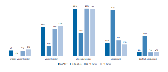 Die Einschätzung der persönlichen Arbeitssituation wird auch von der Arbeitsbelastung überlagert. Die vorliegende Studie untersucht, inwiefern sich die Arbeitsbelastung der befragten Personen in den letzten zwei Jahren positiv oder negativ verändert hat, sie trifft hingegen keine Aussage zur absoluten Arbeitsbelastung. Interessant ist, dass für einen erheblichen Teil der Befragten die Arbeitsbelastung im Vergleich zu Corona-Zeiten (48 %) unverändert ist. 17 % der Teilnehmenden geben an, dass sich ihre Arbeitsbelastung durch die Pandemie verbessert hat, wohingegen 36 % darauf hinweisen, dass sich die Arbeitsbelastung verschlechtert hat. Für eine Mehrheit von 83 % aller Befragten bedeutet Corona somit jedenfalls keine Entlastung. Gleichzeitig schlägt sich das aber nicht auf die Zufriedenheit mit der eigenen Arbeitssituation nieder, was darauf schließen lässt, dass die Befragten gelernt haben, mit Arbeitsbelastung umzugehen. In puncto Altersgruppen gibt es ein Ergebnis, das besonders hervorsticht: 67 % der unter 30-Jährigen sehen eine Verbesserung ihrer Arbeitsbelastung im Vergleich zur Zeit vor COVID-19. Bei den älteren Befragten liegen die diesbezüglichen Werte deutlich darunter (19 % bei den 30- bis 40-Jährigen bzw 16 % bei den > 40-Jährigen). Gleichzeitig sind es nur 10 % der unter 30-Jährigen, die eine Verschlechterung der sehen. Man kann daraus durchaus schließen, dass besonders die Next Generation“ von den neuen Arbeitsumständen im Homeoffice profitiert hat und dass die Belastung, wenn, dann primär bei den Kernleistungsträgern (30 bis 40 Jahre, >40 Jahre) zu beobachten ist. Nachdem sich das Gros der Befragten positiv über die persönliche Arbeitssituation äußert, verwundert es nicht weiter, dass auch die dafür maßgeblichen Faktoren positiv ausfallen. So bestätigen 75 %, dass ihnen neueste Technologien zur Verfügung stehen – ein nicht zu unterschätzender Erfolgsfaktor im Finanzbereich. 77 % sehen sich in guter Work-Life-Balance, gar 86 % sehen ihren Arbeitsplatz als gesichert an und 87 % äußern hohe Zufriedenheit in Bezug auf die angenehme Arbeitsatmosphäre. Auch die Tatsache, dass die an der Umfrage beteiligten Unternehmen eine gesellschaftliche Verantwortung tragen, führt bei 71 % der Befragten zu guter Stimmung. Und last but not least scheint es auch in puncto Remuneration zu passen: 72 % sehen sich gut entlohnt. Auch hier fällt das Urteil der unter 30-Jährigen bei einzelnen Kriterien positiver als bei den anderen Altersgruppen aus.