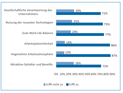 Auch ihre persönliche Arbeitssituation schätzen die Führungs- und Fachkräfte mehrheitlich gut bis sehr gut ein. Verantwortlich dafür sind vor allem Arbeitsbedingungen wie eine angenehme Arbeitsatmosphäre, ein sicherer und technologisch gut ausgestatteter Arbeitsplatz, eine gute Work-Life-Balance und attraktive Gehälter, die im Gros der Unternehmen geboten werden. Die Arbeitsbelastung ist im Vergleich zum Vorjahr meist unverändert, was mitunter auch auf die Vorteile von Remote Work und einer flexibleren Arbeitsgestaltung zurückzuführen ist.