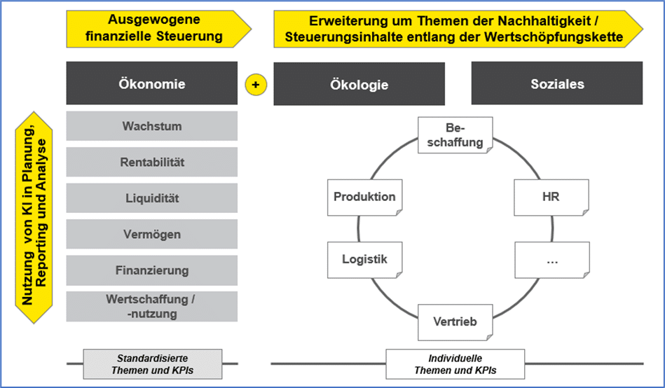 Die Zeiten sind aktuell nicht einfach, aber wie immer in diesen Situationen werden Unternehmen, die über ein aktives, Innovationen gegenüber aufgeschlossenes, Controlling verfügen, auch diese Herausforderung meistern. Wesentlich sind dabei eine ausgewogenen finanzielle Steuerung, die unter der selektiven und unternehmensspezifischen Berücksichtigung des Themas Nachhaltigkeit eine integrative Steuerung ermöglicht und KI-unterstützte, effiziente Prozesse nutzt, um die verfügbaren Controlling-Ressourcen zum Nutzen des Unternehmens bestmöglich einzusetzen (s. Abb. 1).